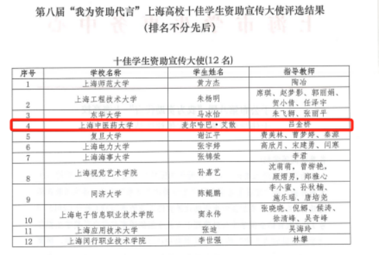 为深入贯彻习近平新时代中国特色社会主义思想和党的二十大精神、二十届历次全会精神,落实总书记关于“完善覆盖全学段学生资助体系”的要求,进一步加强学生资助政策宣传工作,11月13日,由上海市教育委员会指导、上海市学生事务中心主办,上海中医药大学承办的第八届“我为资助代言”上海高校十佳学生资助宣传大使评选活动顺利举行。我校护理学院学生麦尔哈巴·艾散获十佳学生资助宣传大使荣誉称号。