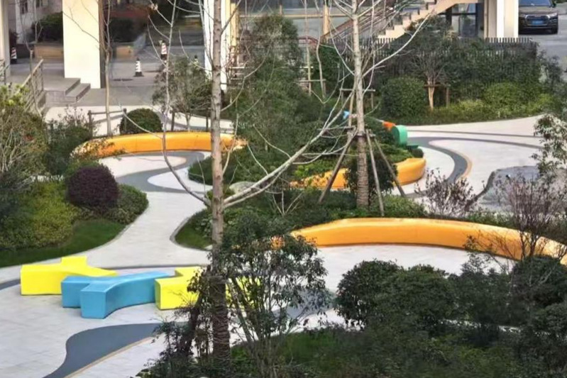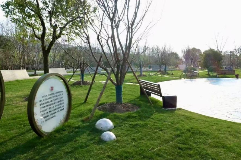 园区的长椅、休闲亭皆是佳处