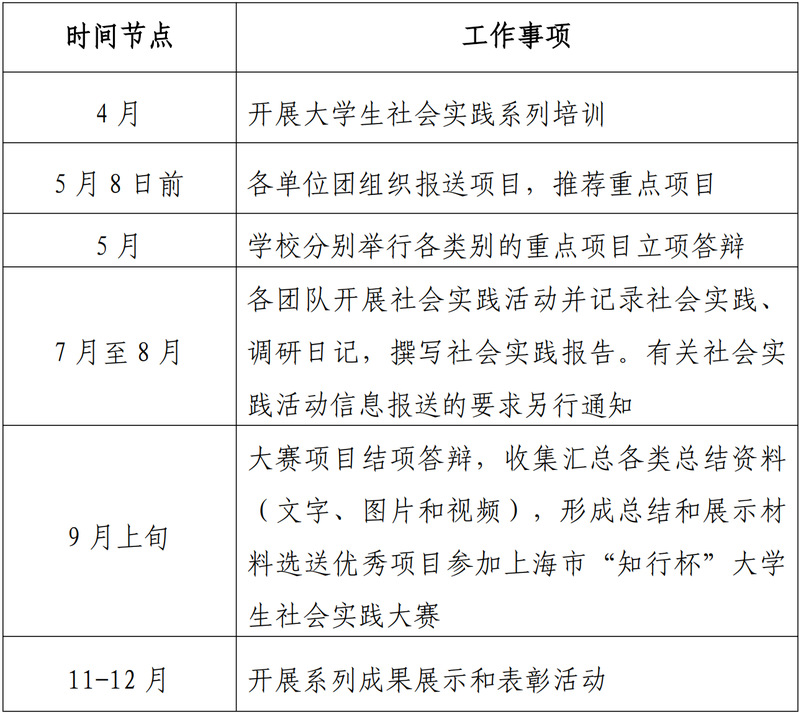 引导大学生聚焦国家重大战略部署,紧密围绕上海经济社会发展的重点领域、重要政策、关键环节,通过社会观察、亲身实践,深入开展社会服务和社会调查,发现面临的难点问题,提出有益的意见建议,形成具有现实意义的研究成果,推动实践成果转化落地。