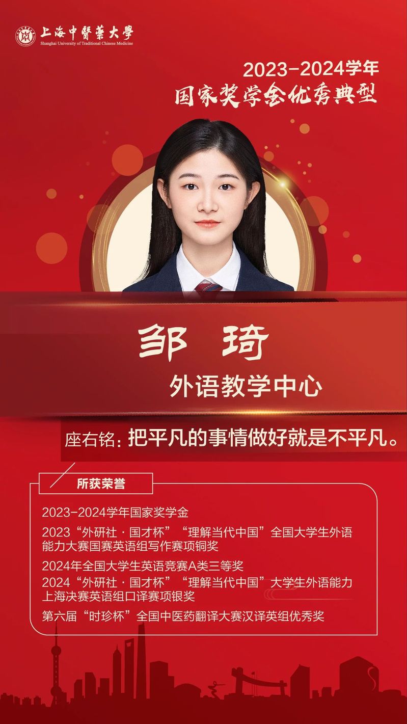 在科研方面,她善于发现问题、解决问题,经验丰富,自学能力强,已发表多篇高质量论文,包括3篇第一作者身份的SCI论文。同时,她还积极参与班级事务,担任学习委员全心全意服务于同学,工作勤勉尽责,一丝不苟。此外,入学以来,她积极参与社会实践,跟随团队深入社区,为超过4000名老年人提供免费体检服务,凭借扎实的专业技能和认真负责的态度,赢得了老人们的高度评价,充分展现了医学生应有的社会责任感和人文关怀。 这些闪耀的名字,是上中医精神的缩影,更是万千学子奋进路上的灯塔。上海中医药大学始终坚持“资助育人”理念,通过完善的资助体系,不仅为学子提供经济保障,更注重培养他们的社会责任感和使命感,助力每位学子勇敢追逐理想。未来学校将继续通过多元化的资助体系,帮助学子们实现学业梦想,激励他们以优异的成绩和卓越的贡献回馈社会,成为中医药事业发展的中坚力量。