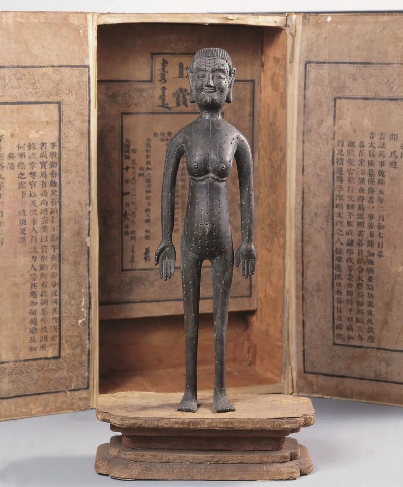 铜人全身刻有14条经脉循行路线及580个未标注穴位名的小圆孔。此铜人是乾隆帝为褒奖编纂《医宗金鉴》的有功之臣,于乾隆九年(1744 年)御制的针灸铜人之一。凡是参与纂修《医宗金鉴》的医官,都得到“原职加一级外,特赏铜人像一个,是书一部”的奖励。这尊铜人的所有者福海,其家族九代均为供职于太医院的名医。1944年,上海名医丁济民从北京一古董店购得,捐给当时的中华医学会医史博物馆