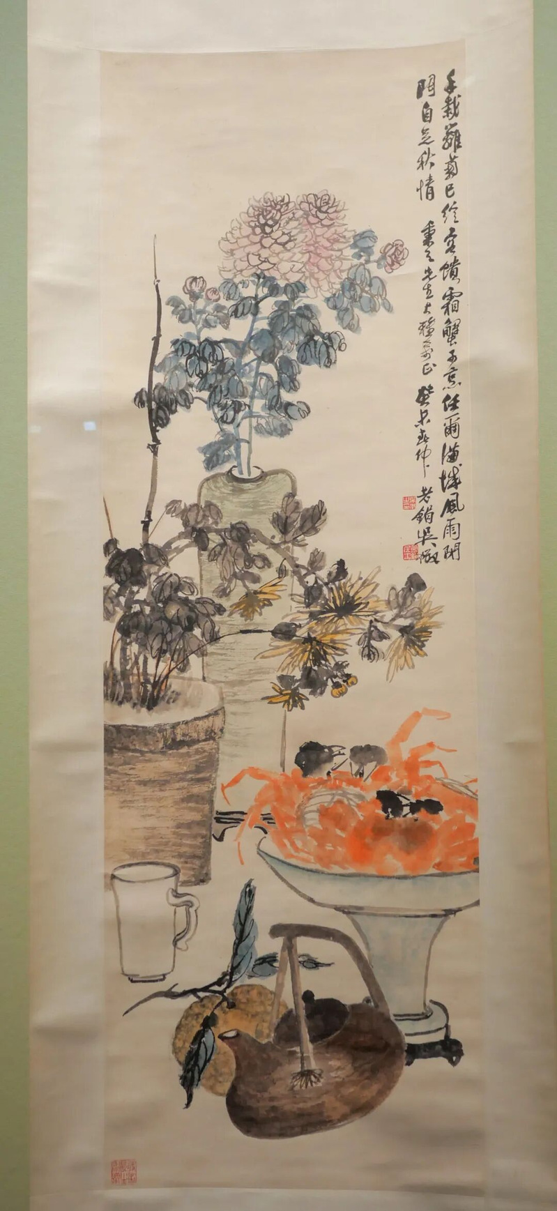 吴待秋(1878-1949)字待秋,名徽,以字行。别号抱鋗居士、疏林仲子等。为民国时期海上画坛“三吴一冯”之一。《篱菊霜蟹图》以“菊、蟹、茶具”为核心元素,菊花枝叶的描绘墨色浓淡干湿变化丰富,老叶用焦墨皴擦、新枝以淡墨勾勒;花瓣则用“双钩填彩”来描绘,笔触更显“秀雅”;螃蟹以赭红勾壳、浓墨画螯,精准刻画蟹壳纹理与螯足锋芒,却以写意笔法来弱化细节,避免“匠气”;茶壶、花盆则用“淡墨枯笔”皴擦,质感朴拙古雅,与菊蟹的鲜活形成“动静、浓淡”的视觉平衡——这正是海派画家“重笔墨趣味,亦重物象神韵”的典型处理。